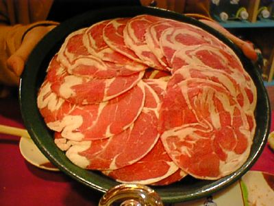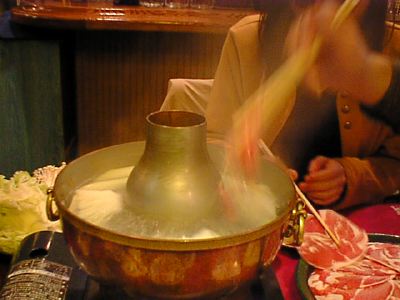 - 4000円のコースにすると3000円のコース+ハロントガになるんだけど、少なめでいいかなと思って、2人前を別に注文しました。量的には十分ですね。でも、よく考えてみるとそんなに値段も違わないか(笑)。こうやって食べてみると、羊肉というのは味が濃くて個性の強い肉だなと実感します。最初ポン酢が欲しいなと思ったけど、食べてみるとポン酢よりゴマだれのほうが羊肉の味に合うように思いました。沸かした湯に塩と千切りのショウガを少々入れてから具を入れるんだけど、食べた後に鍋に残ったスープが、羊肉から出たダシといい、塩加減といい、とても美味しいスープになっていたので、ここにうどんでも入れて食べたい気がしました。少し飲んだけど、後のことを考えてセーブしてるうちに持っていかれてしまってちょっと残念な感じでした。(め)