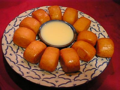 - これはいいですね〜。どうってことのないものなんだけど、油がいいのか、揚げ方がうまいのか、揚げ立てだからか、きっとその全部なんだろうけど、とても美味しい揚げパンです。そのままでもいけるけど、僕は練乳をたっぷりつけて食べるのが気に入りました。デザートってコースの最後をしめくくる大事なものだけど、こういう手もあったかという感じで、意外性と美味しさと楽しさ(この可愛らしい形と大きさがまたいいんだよね)のある、とてもよいデザートだと思います。(め)