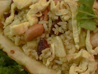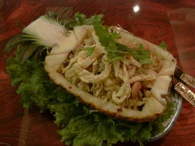 いわゆるパイナップルチャーハン。はじめて食べたけど、なかなかうまいです。ベースの味付けはカレー風味で、パイナップルの甘みと酸味がうまく調和しています。もっともめしさんにいわせるとこんだけうまくてちゃんと食べられるのを出すところは珍しいそうですが。(か)