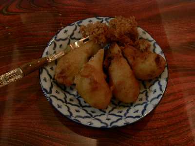 メニューにはタンドリーチキンをつめてあると書いてあったような気がするんだけど違ったか?実際に中身はたしかにitojunが書いてるような感じ。それはさておき、冷めちゃうとちょっとパサつくので熱いうちに食すのが吉。(く)