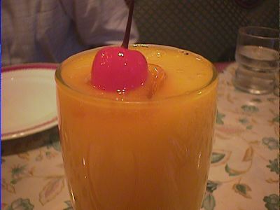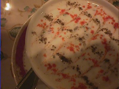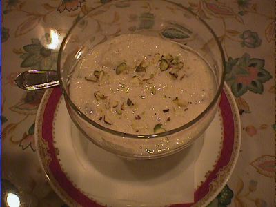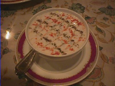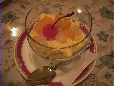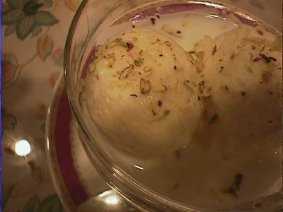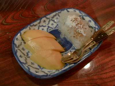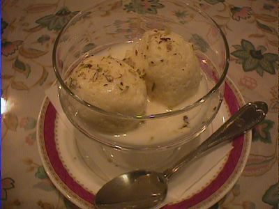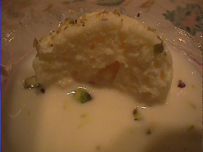 これは甘すぎずおいしかった。下に敷いてあるソースみたいなのは牛乳ですが、これをシロップにするとアジャンタのグラブジャムーン(だっけ?ドーナツのシロップ漬け)になるんだろうなあ、と思った。(い)