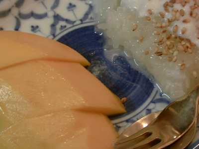 私は練乳+ココナッツミルクと思ってました。本日のデザート中で一番異彩を放ち、なおかつ好み。これに蜂蜜かメープルシロップ垂らしたらまたうまいだろうなぁと夢想します。それにしても、せっかく忘れてたのにくまさんが思い出させてしまって食べたくなって困る。ぐ、ぐ〜っ(az)