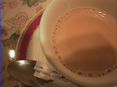 紅茶葉が少ないのか、蒸らし方が足りないのか薄いのがちょっと不満。しかし、ショウガ+クミンかキャラウエィだかの爽快系のスパイスが珍しい味を醸し出してました。(az)