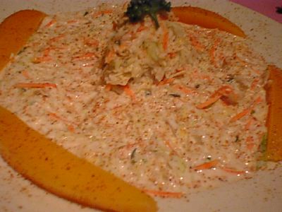 - いわゆるコールスローなんだけども、それだけにとどまらない。驚くべきことにこのサラダにしかつかってないという特別なスパイスが掛けられているらしいけど、なんなのかは謎である。爽やかで良いです。また謎が一つ増えました。(な)