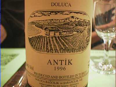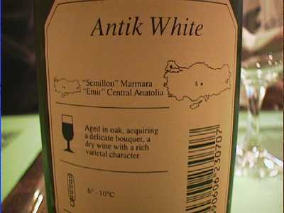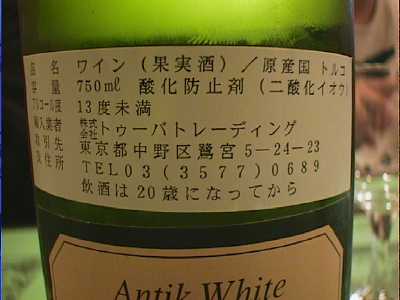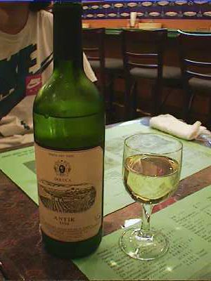 - トルコのワインです。リストには赤白それぞれ5種類くらいのトルコワイン(2500円〜3800円くらい)と、国産ワイン(5000円と7500円かな)がありました。せっかくなのでお店と同じ名前のアンティック(トルコの地名らしいです)の白をとってみました。やや辛口で、口に含んだときに適度な酸味があって、その後まろやかで奥行きのある味がしてきて、後味はすっきりしています。僕の好きなタイプの白ワインで気に入りました。(め)