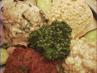 - トルコ料理ではおなじみの、ペースト状になったサラダの盛りあわせです。写真手前の赤いのがトマト、右が皮を向いたナス、奥がヒヨコ豆、左が野菜のミックスかな。トマトはタマネギやニンニクが効いていて、爽やかな味。ナスはヨーグルトで合えてあって、とろりとした食感。ヒヨコ豆はちょっとポテトサラダのような感じ。野菜ミックスはやはりヨーグルトベースだけど、具沢山でサラダっぽいです。どれも塩加減がほどくて美味しいし、味のコントラストがはっきりしているのが嬉しい。ワインとの相性もよかったです。(め)