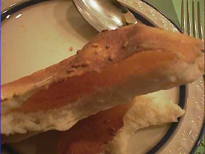 - ちゃんと熱々で手で持てない状態で出てきました。平気で冷めた状態で出す店が多いけど、やっぱりエキメッキはこうでないといけませんね。生地の香りもよく、そのまま食べても美味しい。もちろん前菜のペーストを挟んで食べるとさらによいです。(め)