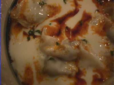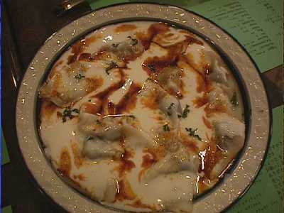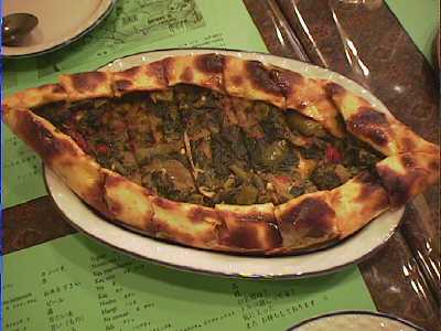- ラビオリというより水ギョウザのほうがイメージが近いですね。ヨーグルトソースとトマトソースが選べます。お店の人によるとトマトソースを選ぶお客さんが多いそうだけど、ヨーグルトのほうがトルコっぽくていいですよねって言ったら同意してくれました。これはウスキュダルでも食べたメニューだけど、このお店のほうが美味しいと思います。ウスキュダルのと比較するとラビオリの皮がやわらかくてコシがあるし、ヨーグルトソースもしっかり手が加えてある感じで、酸味が突出してなくて、いい味です。この料理のポイントはヨーグルトソースにかかった茶色(ウスキュダルでは鮮やかなオレンジ色だった)の油だと思うのだけれど、香ばしくとてもよい香りがして、ヨーグルトソースともよくマッチしています。とても気に入りました。トマトソースのほうも一度食べてみたいですね。(め)