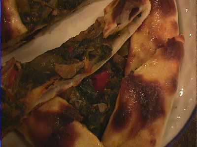 - この形のピザは他に「挽き肉とタマゴのピザ」「チーズピザ」もあったけど、ホウレン草のはちょっとめずらしい気がしたのでこれにしました。薄めの皮は端の部分までサックリしていて生地自体が美味しいし、具のホウレン草もトロッと仕上がっていて生地によくマッチしています。僕はクリスピーなピザが好きなので、このピザは高く評価したいです。(め)