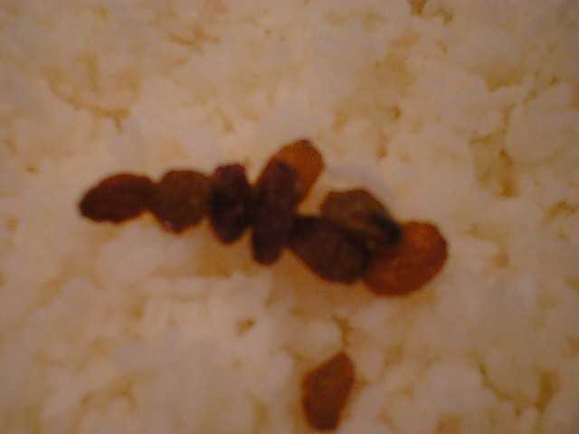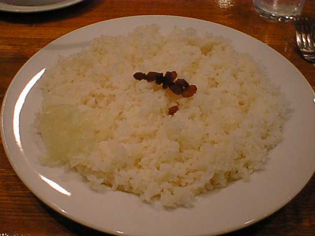 - カレーにはライスがついてきますが、おかわりで一皿追加しました。干し葡萄とタマネギスライス(薄い甘酢漬け)がのってきます。