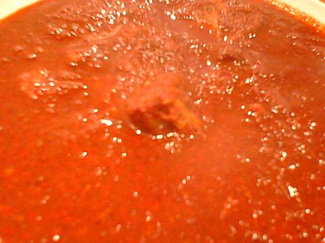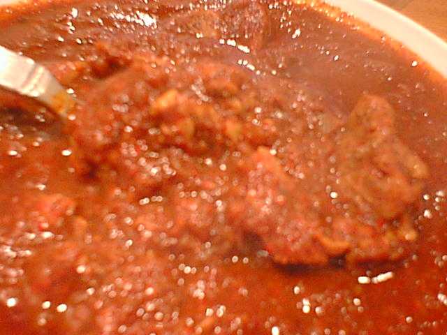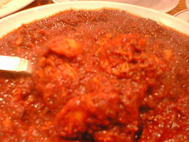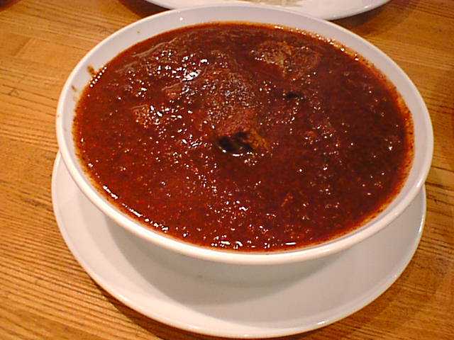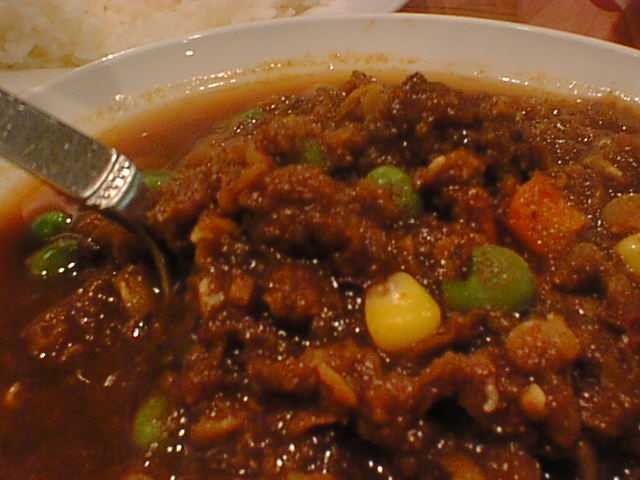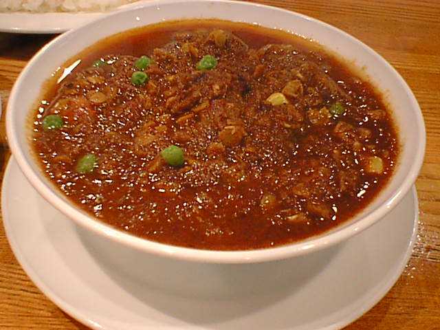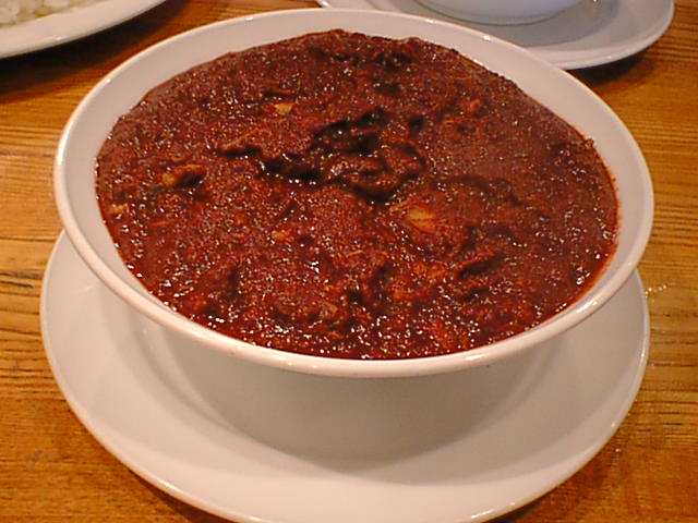 - ここのカレーはまずベースをエキストラ(少し甘め、100円増し)とレギュラー(さっぱりした辛さ)から選び、次に辛さをマイルド、セミホット、ホット、さらにレギュラーに限りベリーホット(400円増し)、スペシャルホット(500円増し)の中から選びます。せっかく来たので一つはスペシャルホットにしてみようということで、チキンをスペシャルホットにしました。出てきたのはドロドロのペースト状のもの。確かに辛いんだけど、チリの味しかしません。辛くて味がわからないとかいう問題ではなく、何の奥行きもうまみもないただのチリペースト。カレーとして成立していません。ここの主人はどういうつもりでこれ(スペシャルホット)をメニューに載せてるんだろう。しかもこんな値段をつけて。ただの話題作りのためとしか思えません。(め)