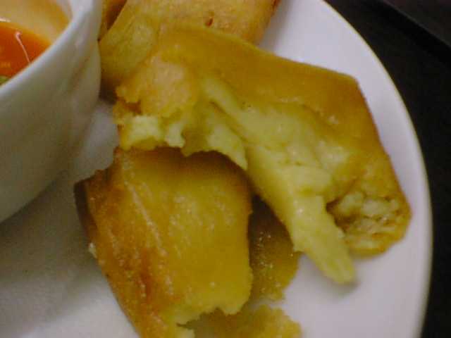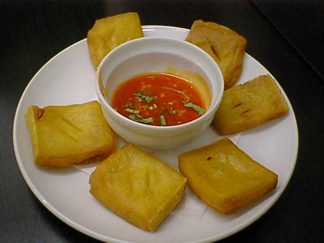 - トーフジョーの揚げる前のものを長めの拍子切りにしてニョクマム等(?)と一緒にいただきます。見た目や色は玉子豆腐のようです。しかし食感はあれほどツルルンとはしておらず、懐石料理のゴマ豆腐のように葛がねられたようなねとっと吸い付く感じも少しあります。(az)