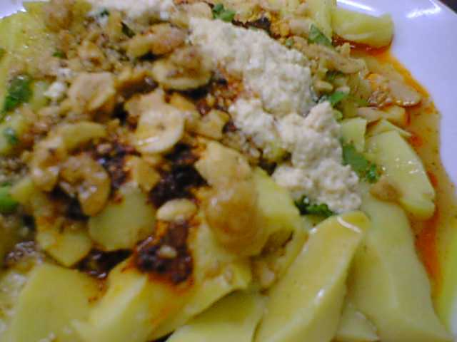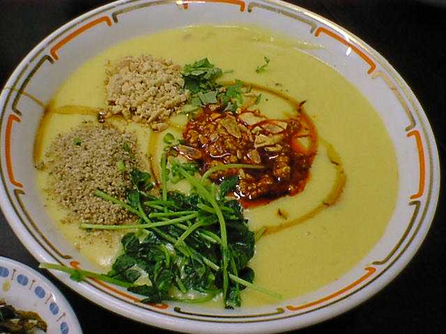 ミャンマー料理の中でもシャン族の料理ということで初めてのなのですが、以外はほぼ台湾系中華料理といっても差し支えないくらい馴染みのあるものでした。ミャンマーと言ってもシャン族は海岸線から離れた山の中での生活ってことで、新鮮な海産物調理するよりは、保存させた海産物、保存のきく発酵食品、豚肉の調理という方面に長けているようで、中国の食文化をうまい具合に吸収していったという感じです。そしてこのお店の料理の特徴ともなってるかもしれませんが、トッピングにすりゴマ&粗ずりピーナッツが多用されていて、旨味と食感の変化を楽しむことに役立っていると思います。香菜もほんの隠し味程度ではあるけど多用されてたかと感じました。10年以上(だっけ?)日本に住んでた方の開いたお店なので言葉に困ることはまったくありませんし、なによりも安くておいしくって化学調味料使ってなくって、その上店の方がいい方ばかりでおすすめです。唯一惜しいなぁと思うのは立地。駅のガード近くで酔客たちがうろつくビルの一角な為、女性一人では行きづらいかもしれないってところでしょうか。(az)