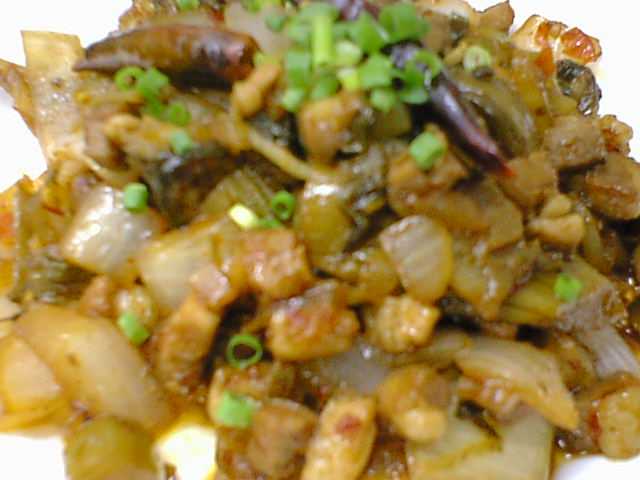 - あぁご飯にかけて混ぜくって食べたい!! 日本の高菜とは味付けちょっと違うのかな、日本のものでも古漬けに近いタイプです。この豚と高菜の組あわせは中華系では細切り炒めとかで割とポピュラーですけどね。賽の目の豚ってのも歯ごたえ楽しめていいものだと発見しました。(az)
