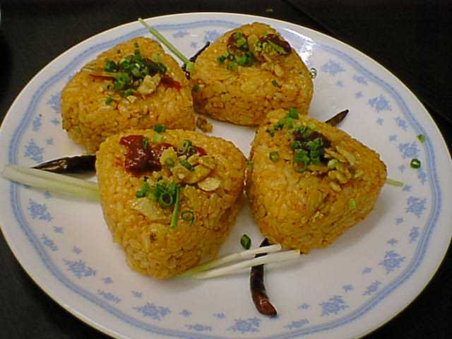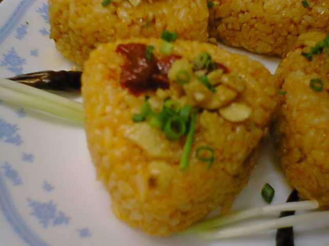 - チキンライスのお握りとでも言うのかな。上にのってるのはナッツだっけ。(な)