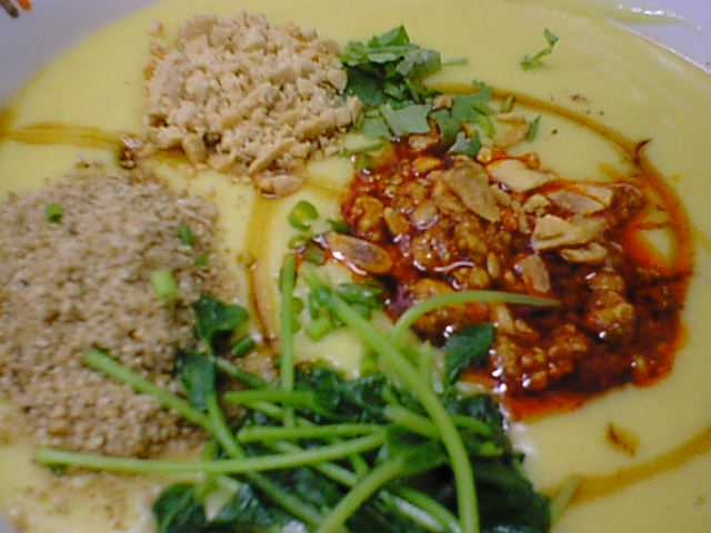- 出てきた時そばがいっさい見えず、巨大な茶碗蒸しのようで「これ全部あの豆腐(トーフー)かいっ??」て胃の方を心配しましたが、混ぜくって麺に絡ませると、あんがいあっさり無くなりました。あのプルプルしたトーフーを固める前だというのはすぐわかりましたが、なぜかこの状態はざらっとしたものを感じて「?」と不思議に思ったものですから、玉子系豆腐なのか大豆系豆腐なのか知りたかったので、店の方に確かめましたら、大豆ではないけどやはり豆だとのことです。「うむうむ私が気にいるはずだ」と納得しました。(az)