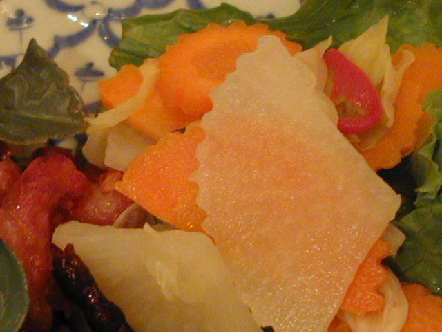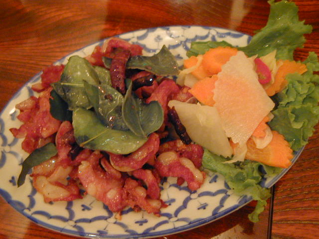 - 前に食べた時よりも少し柔らかめという気がしたけども、それでも軟骨はコリコリで、とてもよい食感でした。上にのっている葉っぱもサクサクに揚げてあって、香ばしくてとてもいいです。この料理を食べる時は、この葉っぱも是非食べて欲しい。おすすめ。(び)