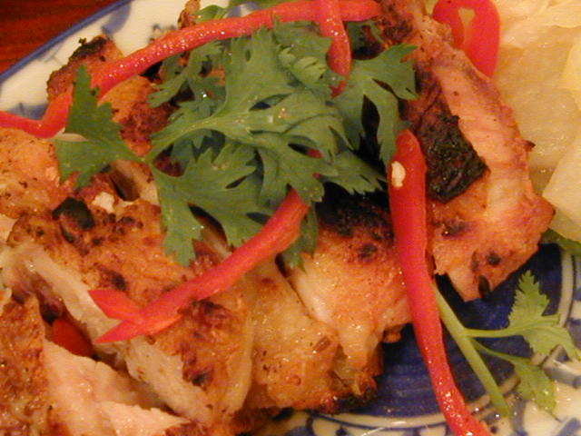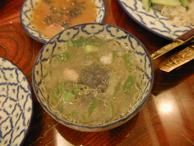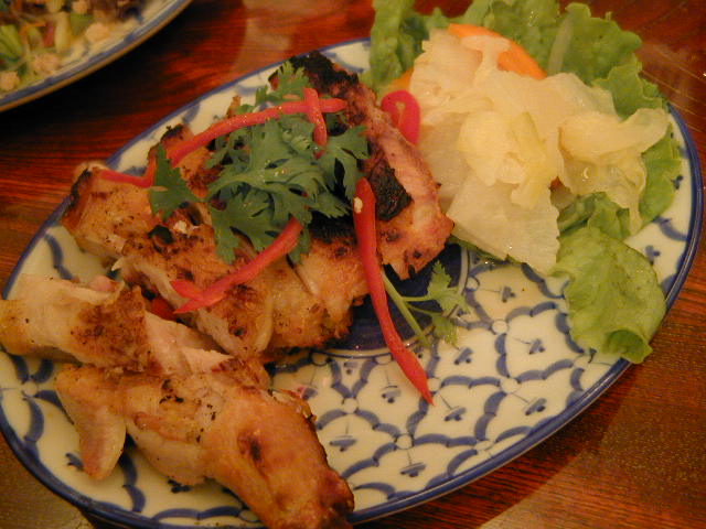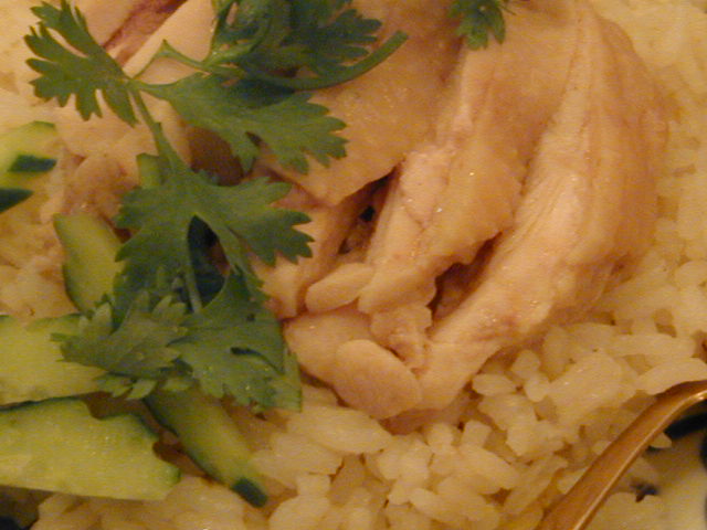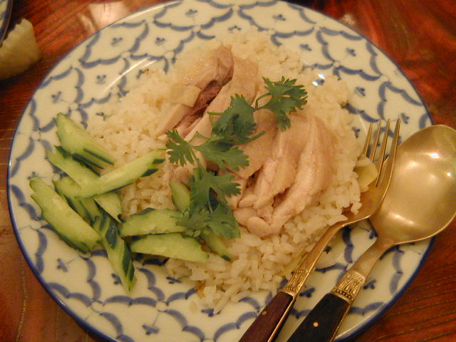 - 鶏スープで炊き込んであるご飯(これは事前にお願いしておいたバージョンだから?)なんとも美味しいです。濃いめの味が好みの人はタレを混ぜるとよいけども、タレを付けないでも十分美味しく食べられます。スープもなかなか美味しいのだけど、今回は大根が切れていて入ってなかったのがちょっと残念。カオマンガイはひとりでかかえて食べたい。おすすめ。(び)