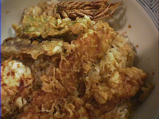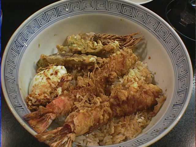 - 天丼の器、凄く大きいそうです。下の最初の写真で味噌汁の器と見比べてみるとわかりますね。器が大きいので、上にのっている天ぷらを他に移さないでも、最初からご飯が食べられるところがなかなかいいらしい。(び)
