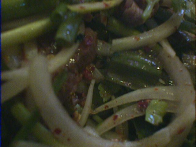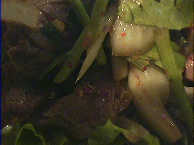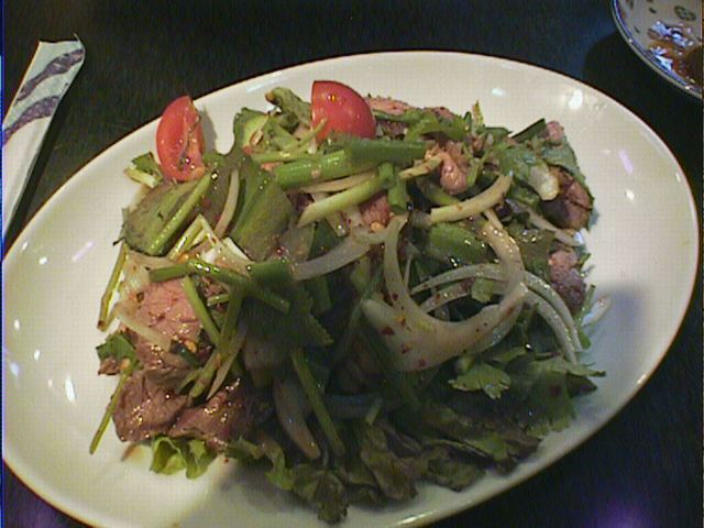 - さらしてないタマネギと香草が刺激的(もちろんいい意味で)。タレの味もOK。量もたっぷりしてるし、ちゃんとプリッキーヌ使ってるし、よかったです。(め)