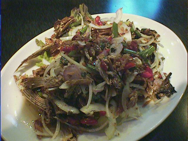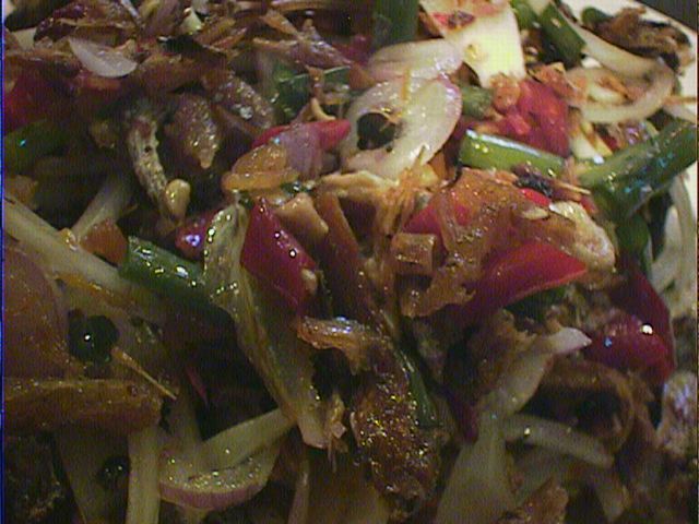 - メニューの写真では衣のついた揚げ魚の入ったヤムという感じでしたが、実際はカリカリに揚げて砕いた魚がたっぷりと入っていました。よく揚がっているので骨までちゃんと食べられます。プリックたっぷりでしっかりと辛さもあって○。(め)