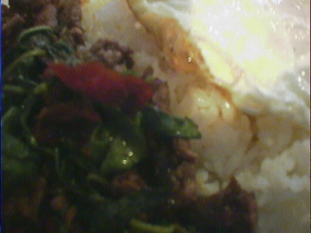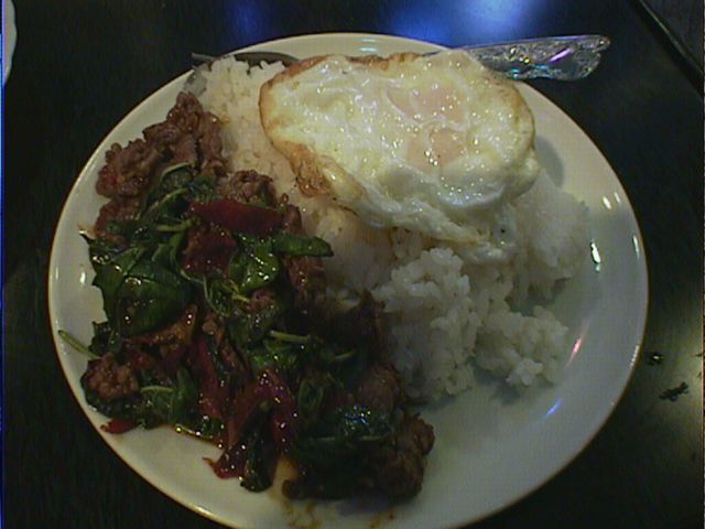 - いわゆる牛肉のカパオ炒めかけご飯、目玉焼きのせです。ライスが日本米だったのが残念。(め)