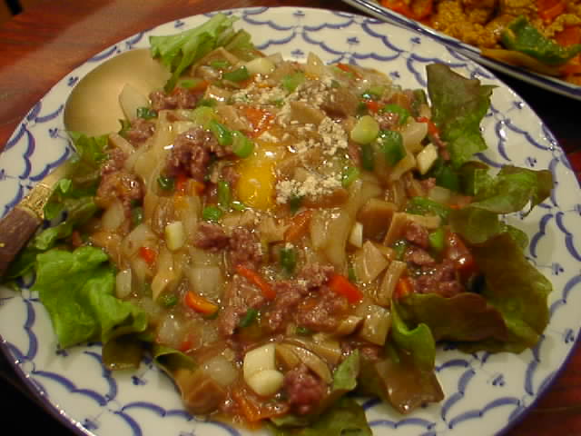 - 麺の上にユッケみたいな半生の肉と生卵がのっていて、それに熱くてとろみのあるタイ風のソースがかかっているという感じかな。熱いソースで半生の肉と生卵が丁度いい具合になっています。