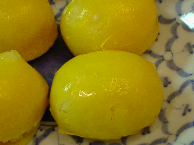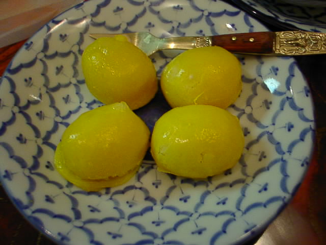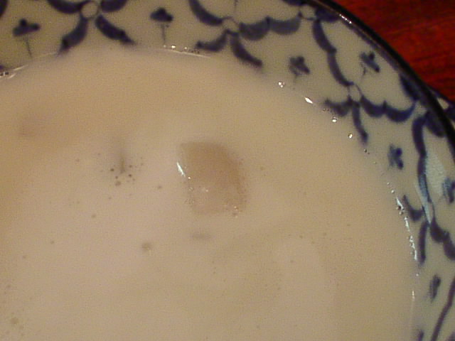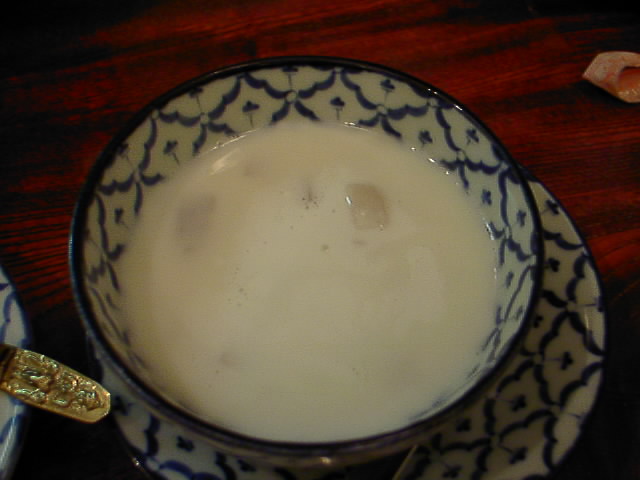 - 温かいココナッツミルクとサトイモです。とっても辛いグンチュアナムプラーを食べた後に、この甘いデザートを食べるとほっとしますね。(び)