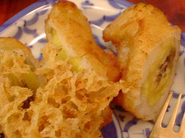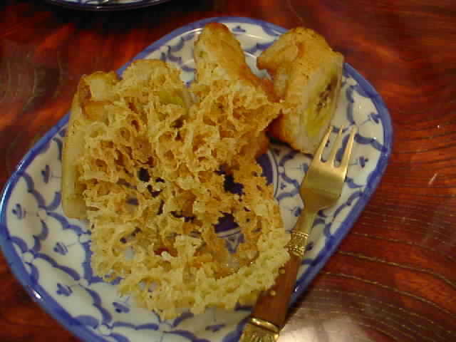 - 網みたいなのは、揚げバナナの衣と同じ素材を網状に揚げて作った物だと思います。かき揚げの衣みたいな感じの味でした。(び)