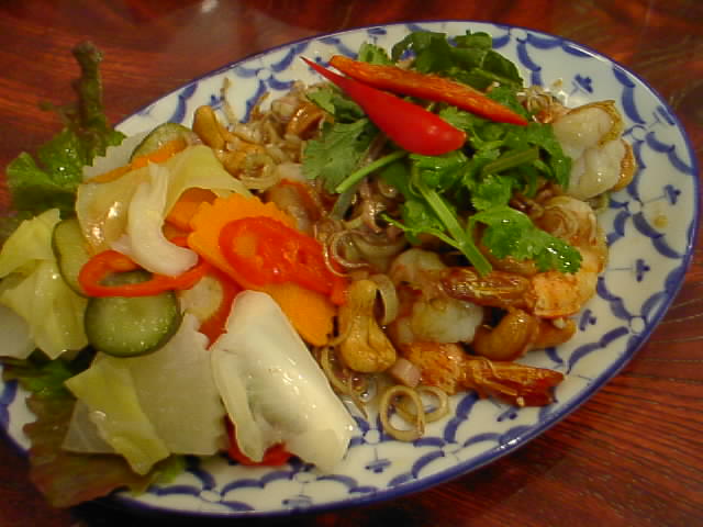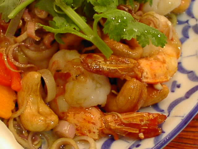- エビとカシューナッツの炒め物。レモングラスがたっぷり入っています。エビとカシューナッツが主役の料理だけど、油で炒めたレモングラスもとても美味しい。