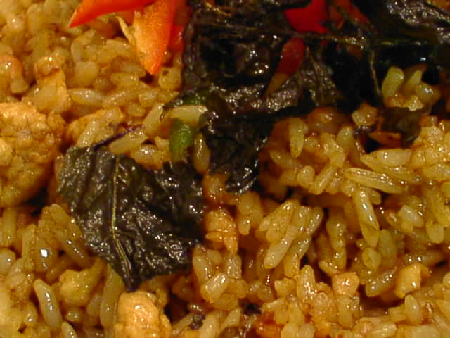 - ちょっと辛くてバジル風味の鶏肉チャーハンです。エビバージョンも好きなのだけど、今日は他の料理でエビは食べたので鶏肉にしてみました。