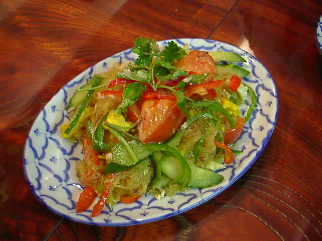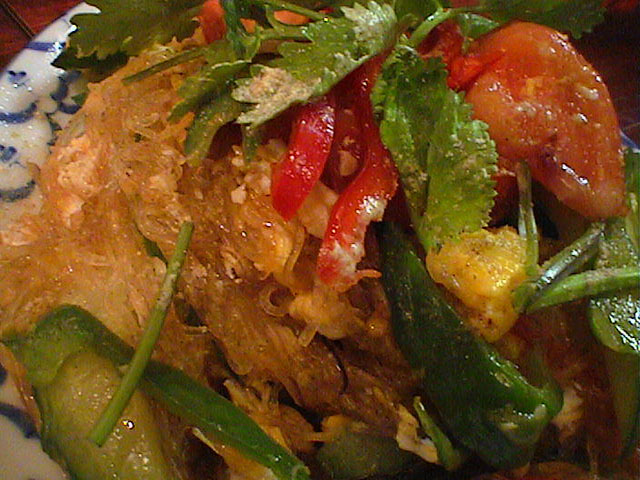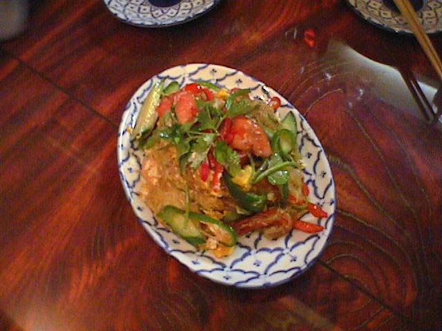 春雨、玉子とじ、トマト、ピーマン、赤ピーマン、キュウリ。ミョウガみたいなのも入ってたけど、エシャロットかな。これかなり気に入りました。(び)
