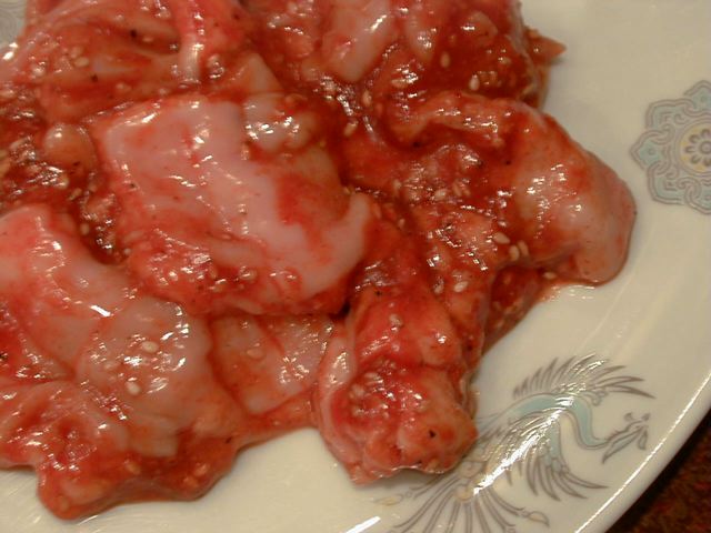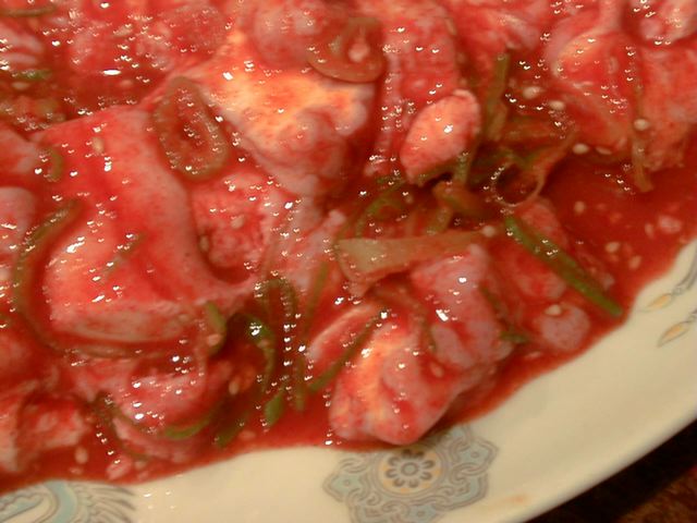 - ミノ(牛の第1胃)が上ミノしかメニューにないねと話してて、結局kumaちゃんがガツを選んだんだけど、帰って調べてみたら、ガツって豚の胃袋のことだけじゃなくて、いわゆるミノのことも指すんですね。でもってこれは牛のほうですね。しっかり厚みがあって、コリコリしてます。ミノって噛みしめるとコショウのような臭い(粉にして売ってるほうのコショウって粒コショウを挽いたときにはない独特の臭いがあるでしょ?肥料みたいな臭いっていうか‥‥あの臭いね)がする気がします。好きな人はそこがいいのかな??(め)