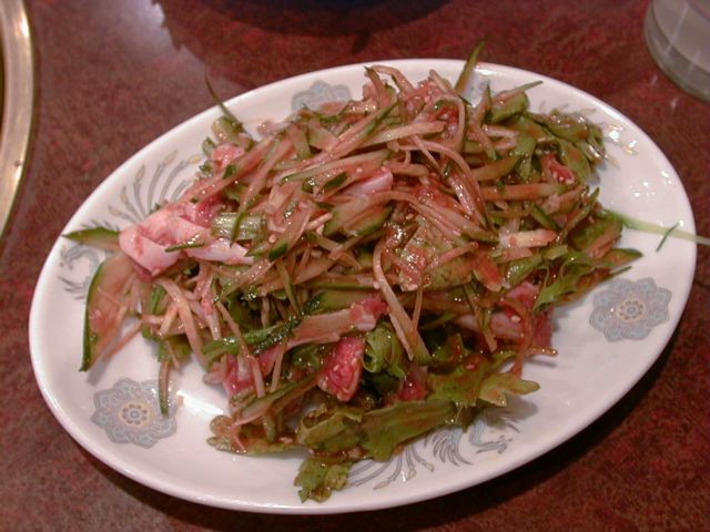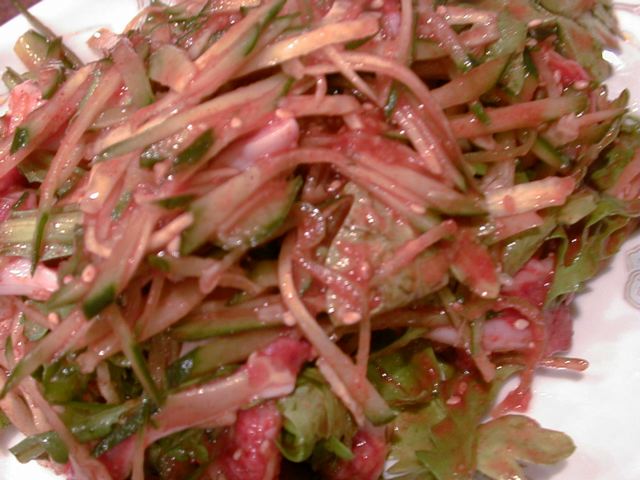 - 牛の子宮壁の刺し身。こちらは短冊に刻んだコブクロをやはり細く切ったキュウリや菊菜と一緒にタレで和えてあります。コブクロは単体で噛みしめるとちょっと臭みを感じるので、このように野菜と和えてサラダ感覚で食べるのは美味しい食べ方だと思います。タレは脳みそ刺と同じものが水分で薄まっている感じ。コブクロにクセがあるので好みは分かれると思いますが、一度食べてみることをおすすめします。(め)
