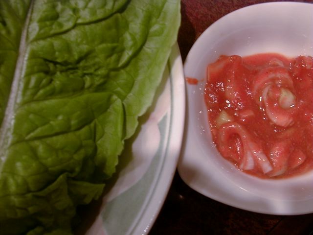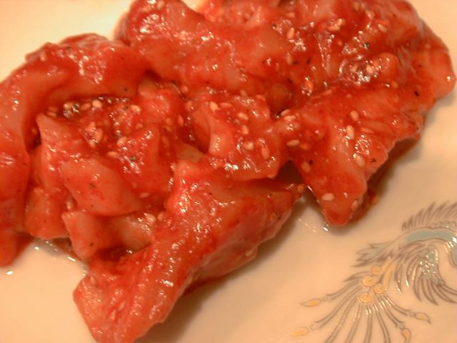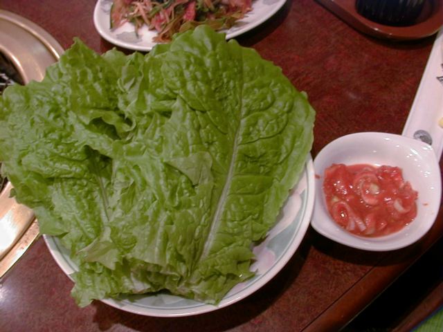 - サンチュを注文するとサニーレタスを出す店が多いけど、あれは根元がパリパリして包みにくいし、もともと水っぽい上にしばしば洗った水をよく拭いてなくて、ビシャビシャしてイヤですよね。その上妙に枚数が少なかったりするし。ここのはちゃんと水気をとったサンチュがたっぷりと20枚くらい出てきます。しんなりしたサンチュで包むと焼肉の味も引き立ちます。(め)