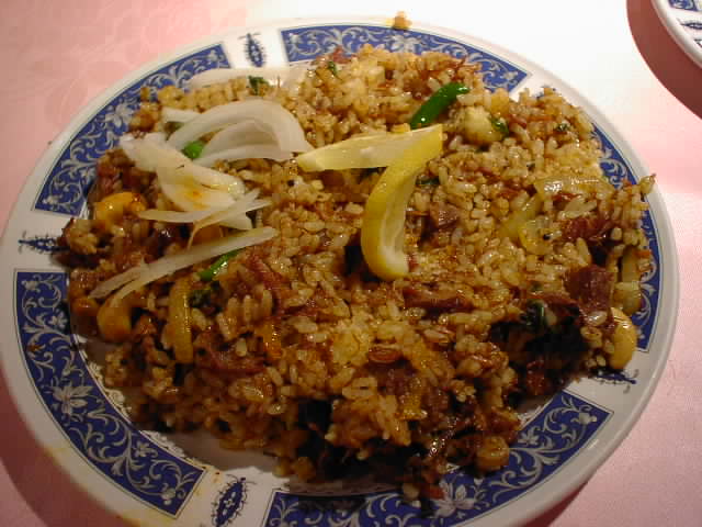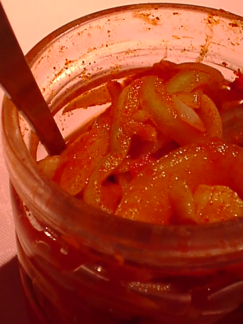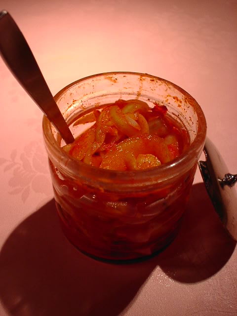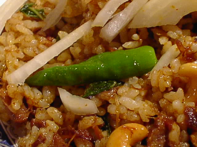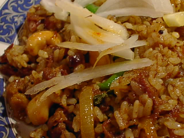 - 入っている物が以前と少し変わっていました。マトン、カシューナッツ、タマネギ、レーズンといった以前からお馴染みの具の他に、獅子唐辛子のような物と、バジルのような葉っぱが入っていて、以前入っていたピーマンとトマトが入っていませんでした。それから、以前から入っていたころっとした肉の塊の他に、コンビーフ状になった肉がたくさん入っていました。