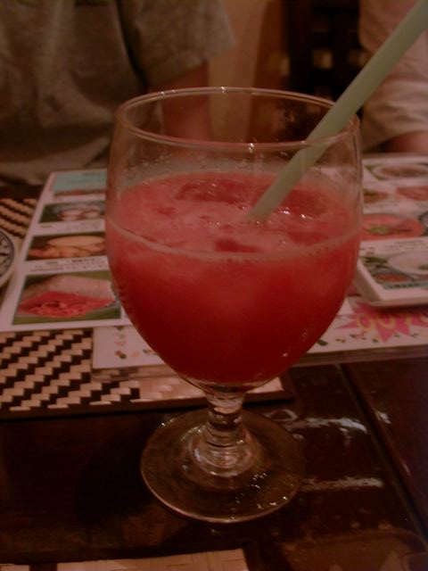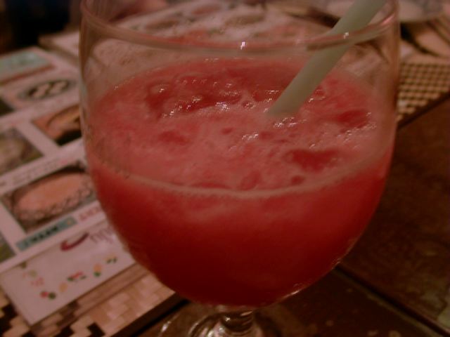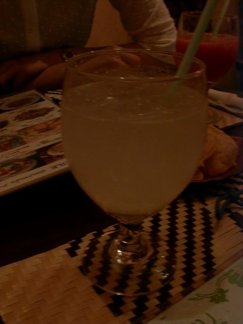 生ジュースのメニューが別にあって、すいか・メロン・オレンジ・パイナップル・ココナツ・マンゴー・バナナとあるので、ココナツ(kaze)やマンゴー(koo)を注文しようとしたら、どちらもできないと言われたので、kazeさんは普通のココナツジュース、kooさんはすいかジュースに変更しました。すいかジュースは「そのまんまの味(koo)」だそうです(笑) あ、レシート見るとココナッツジュースが普通のやつなのに生ジュースの値段(600円)とられてるなぁ。いけませんね。(め)