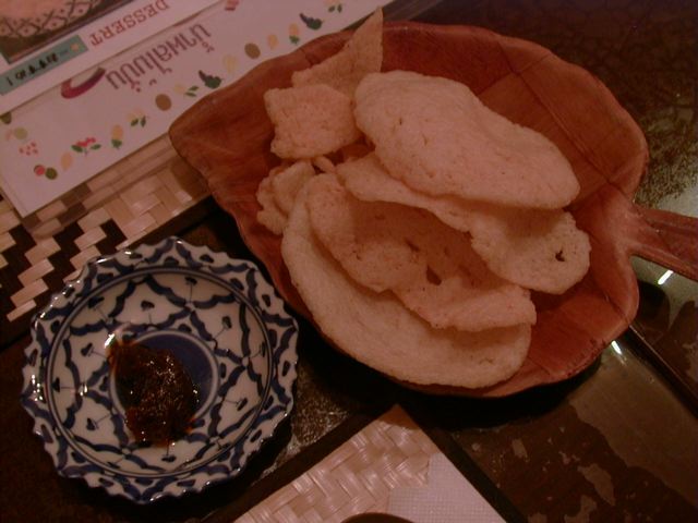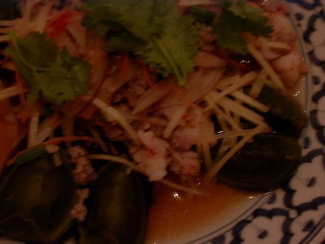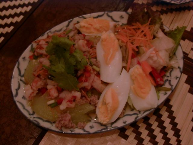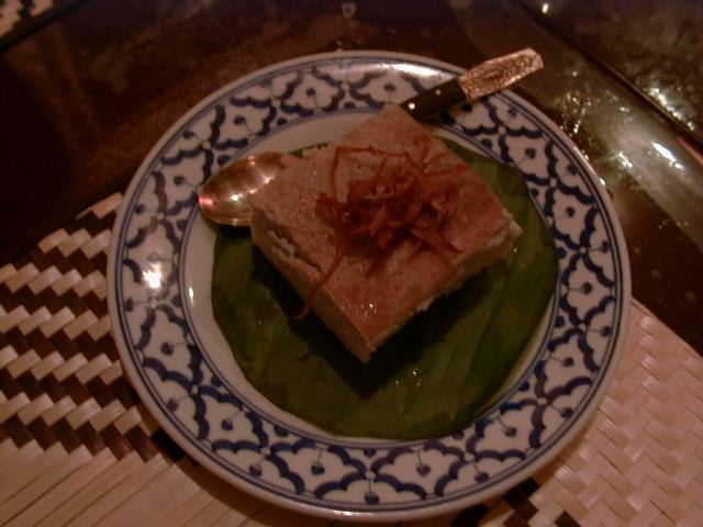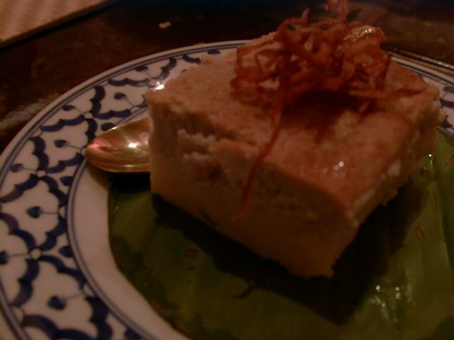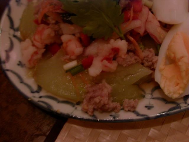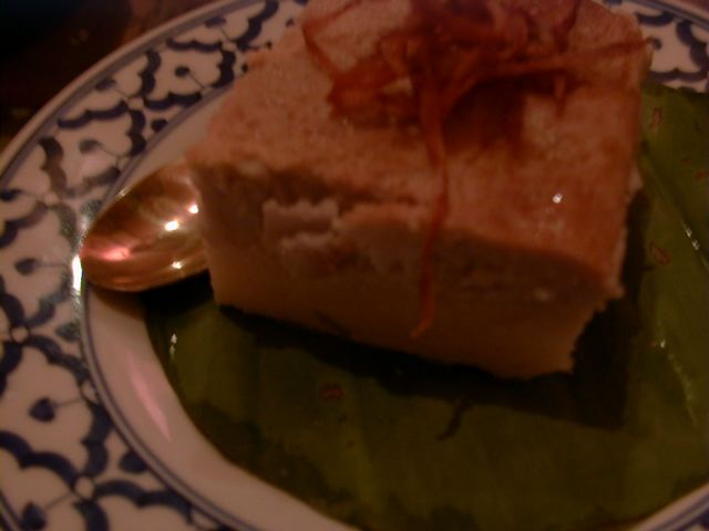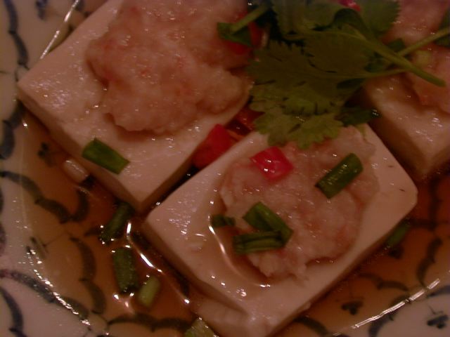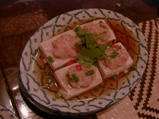 ちょっと変わってるので注文してみました。皿が重なって出てくるのは、この料理がとても熱いからです。味のほうは見た目通りというか、絹ごしの豆腐にエビのすり身をのせて、ナムプラー風味のタレをかけて蒸し器で蒸したという味です。豆腐好きなので結構気に入りました。(め)