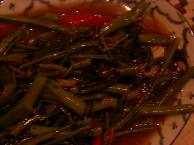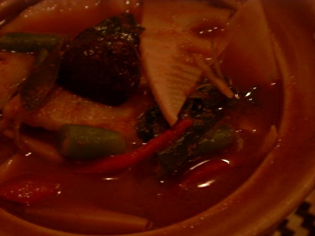 メニューにはないんだけど、Kazeさんの希望で店の人にお願いしてみたら、作ってくれました。豚肉と魚の頭と作れるそうだけど、豚肉にしておきました。一人でかかえて食べたいというものじゃないけど、この独特の香りとサラサラした辛いスープがいいですよね。(め)