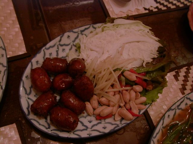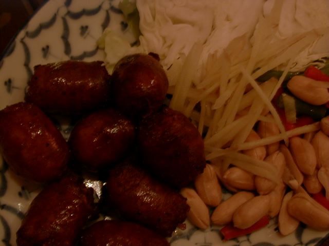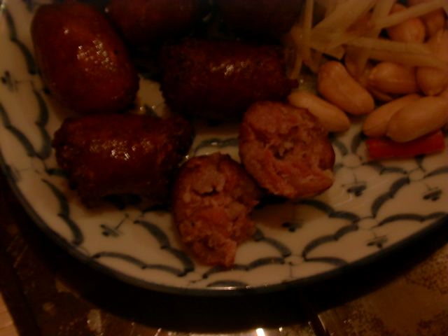 コロッと小さく作ったソーセージを揚げたものですね。熱々で外がパリッとしててなかなかいいです。付け合わせのショウガやピーナツ、プリックと一緒に食べます。あ、これもメニューには800円とあるのに880円取られてますね。打ち間違いかなぁ。(め)