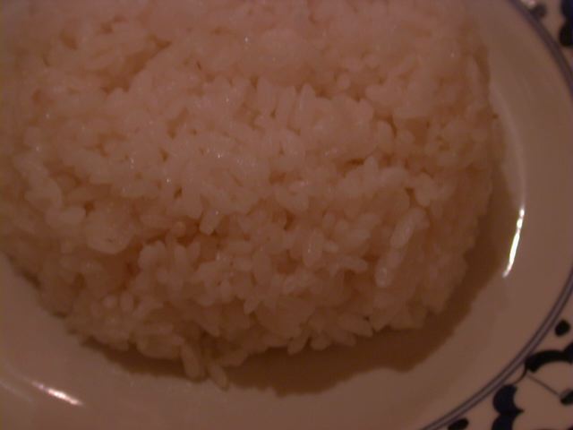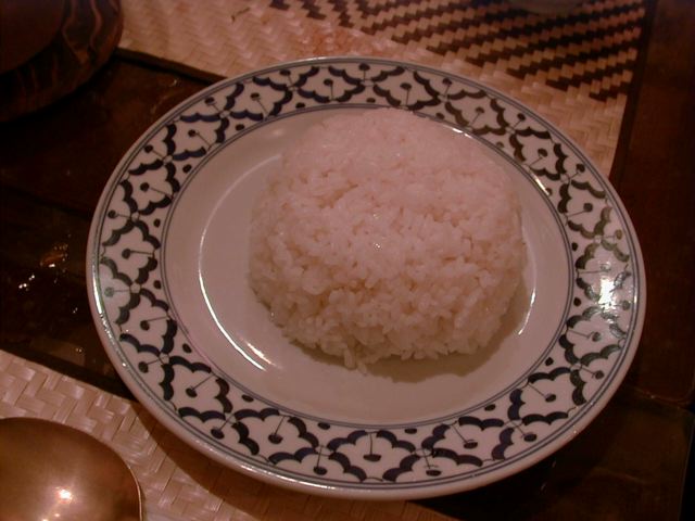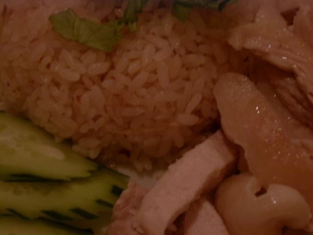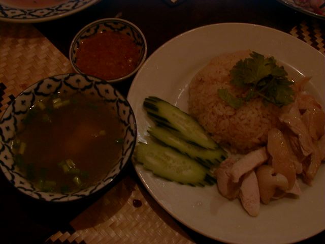 僕の大好きなカオマンガイがメニューにあったので迷わず注文。カオマンガイというのは予約して作ってもらわないかぎり、ちゃんと鶏スープでご飯を炊くというのは難しいので、どうしても炊いたご飯に鶏スープを炒め込むという調理法になるんだけど、ここのは上手に作っています。変に油っぽくなくて美味しいと思います。スープがダイコンのスープでなく豆腐のスープなのがちょっと残念だけど、いつでも注文できる店の中ではおすすめできるほうのカオマンガイだと思います。(め)