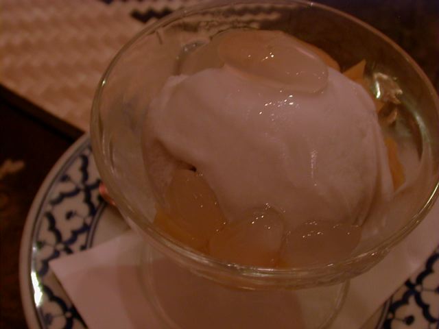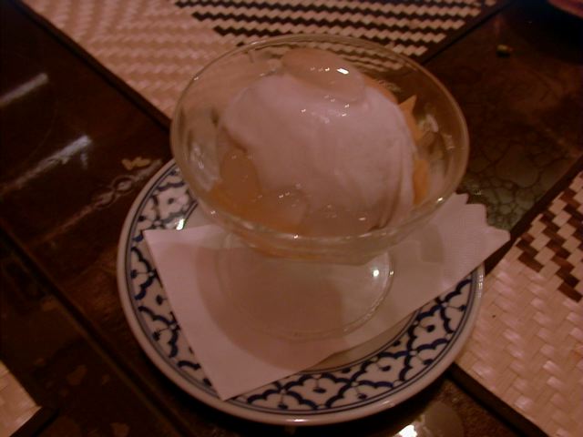 デザートに青いマンゴーや甘いマンゴーなどのフルーツ類が載っていたので、もしやと思い聞いてみたら、やはり今はないということで、残念だけど他のものを注文。ここのカノムモーケンは冷たい状態で出てきます。っていうか下の方は凍っててジャリジャリしてます(笑) 温かいカノムモーケンに慣れている身にはちょっと新鮮です。むむ。これもメニューに400円とあるのに500円取られてるな。(め)
