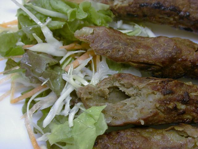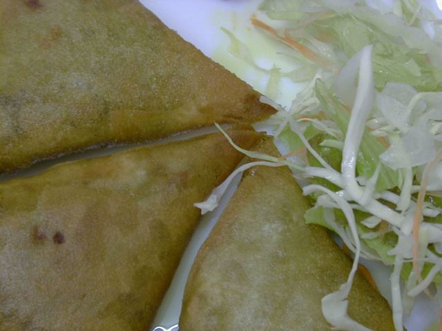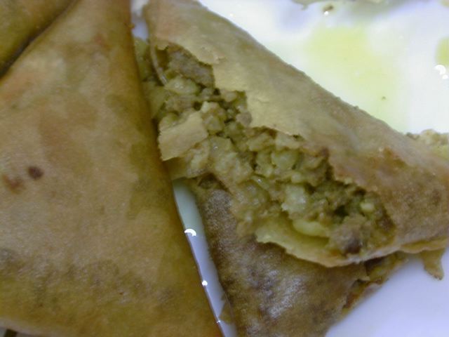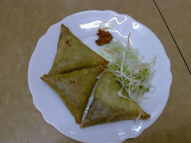 テトラパック状ではなく、薄っぺたいサモサ。挽き肉とタマネギにカレー粉で味付けして春巻きの皮で包んで揚げたという感じのものです。これとほぼ同じものをどっかで食べたことがあるなぁ。(め)