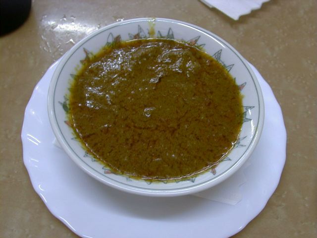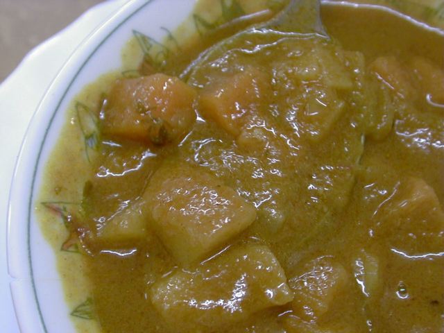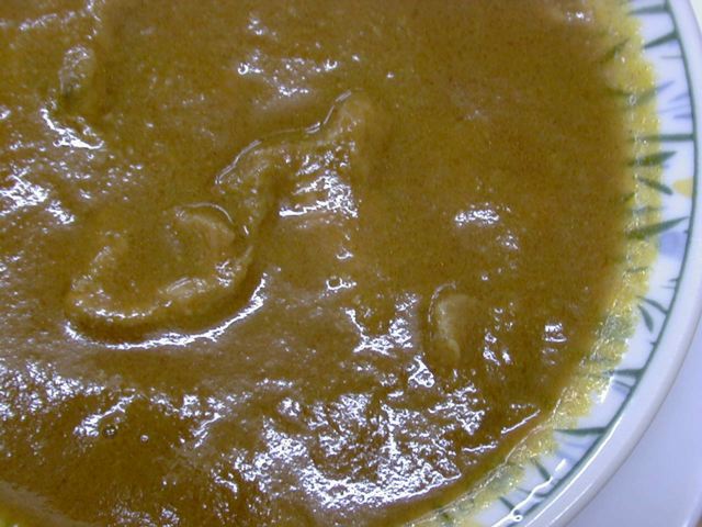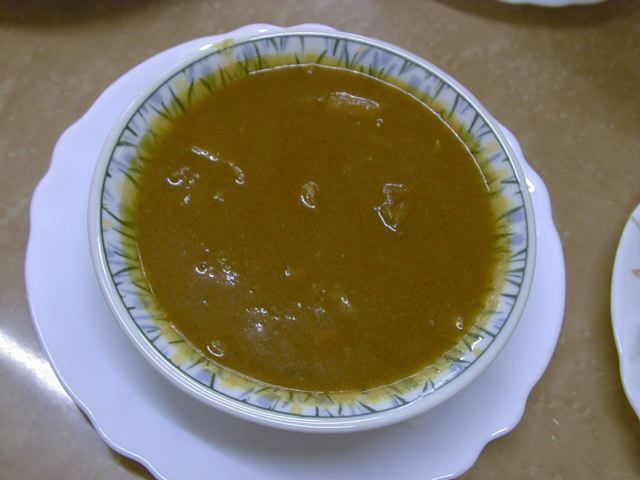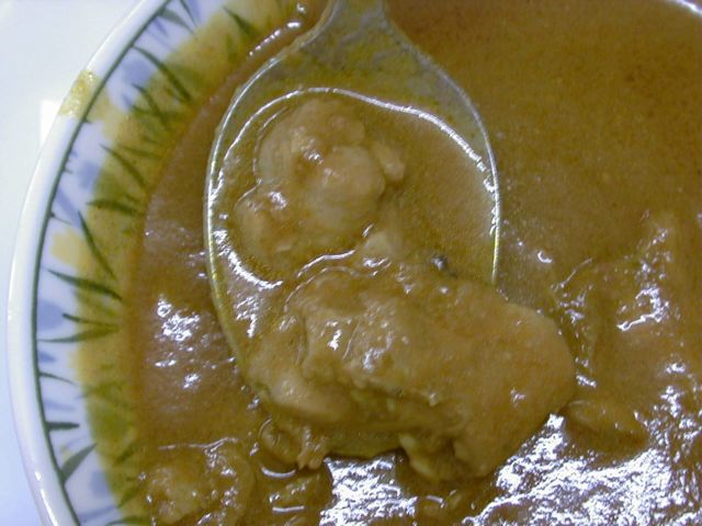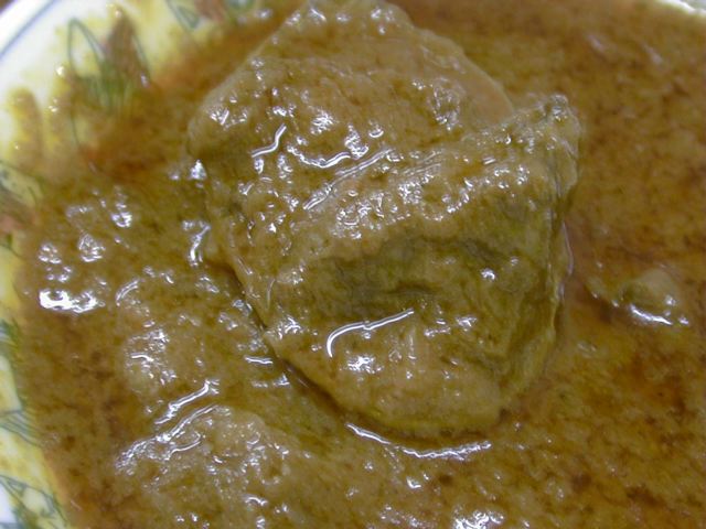 今日食べた3種類のカレーに共通して言えるのが、どれも味がまろやかでフルーティな甘味を感じることと、特定のスパイスが際立っているわけではないけど、やっぱり向こうで育った人ならではスパイスの使い方がしてあること。甘味はリンゴでも入れてるのかなと思ったけど、後で聞いたらタマネギだけの甘味だとのこと。甘味が後に残らないのはそのせいかな。このマトンカレーもたっぷり油の層があるけど、決してしつこくない、正しいマトンカレーです。ご飯にもポルタにも合います。(め)