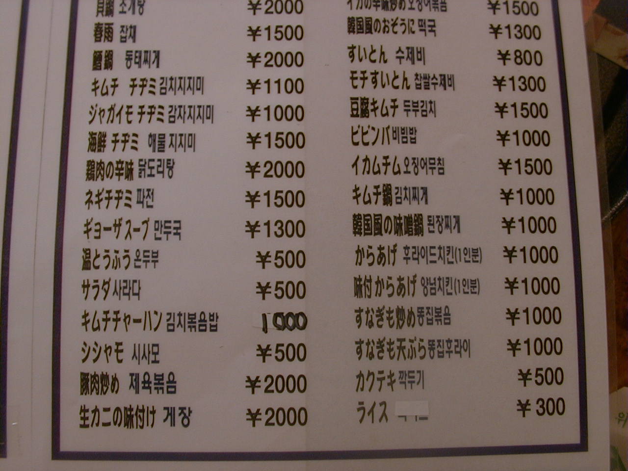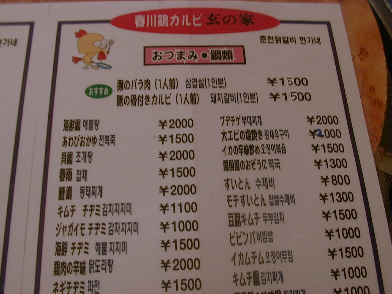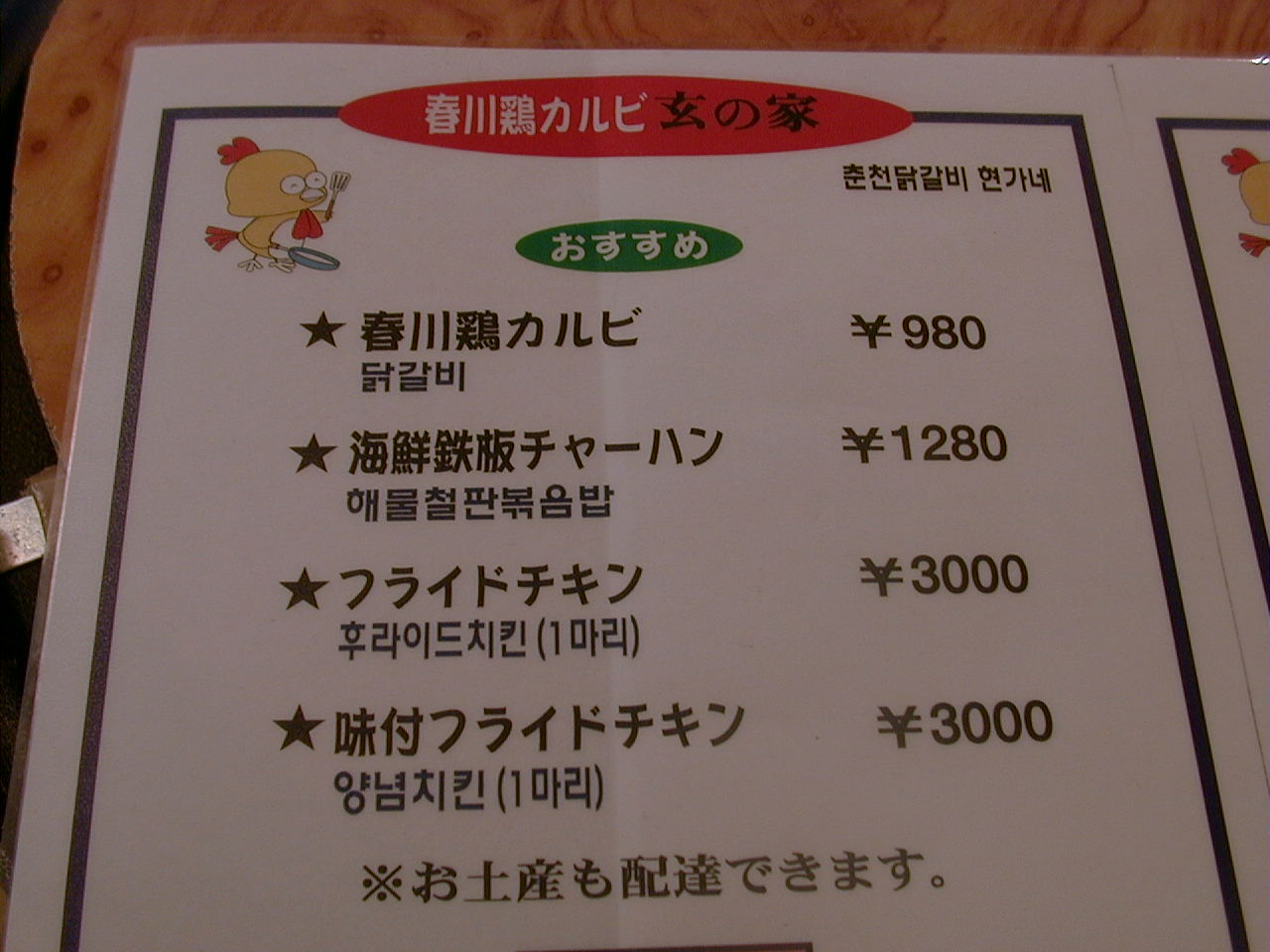 2000/9/23: 玄の家(春川鶏 カルビ & フライドチキン)のメニュー