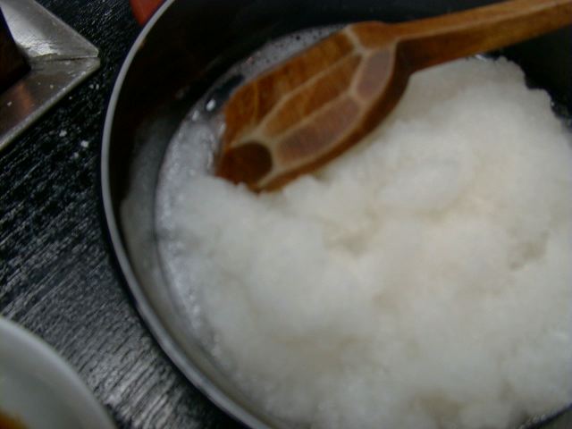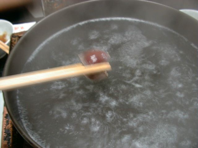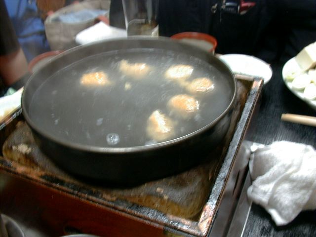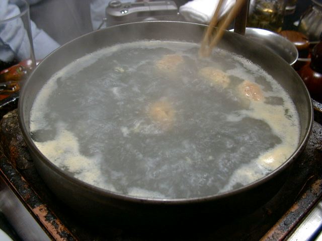 直前に挽肉と地鶏の黄味を混ぜて、一口大にして鍋に入れてくれます。(JK)