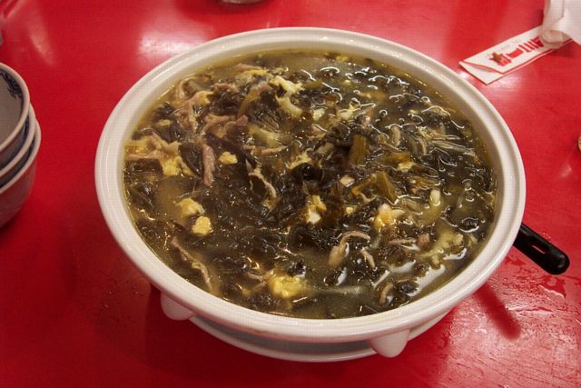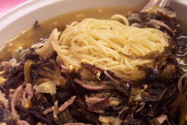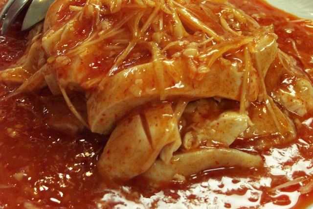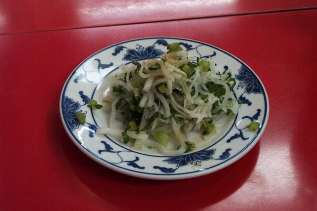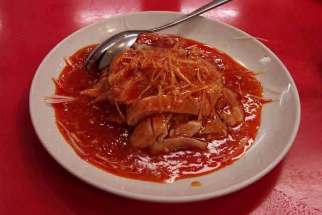 - 私がこれまでに経験した「葱絲油鶏」は、衣をつけてカラッと揚げた熱々の鶏肉をキャベツの上にトンカツのようにカットして並べ、これまた熱々のネギソースをジュワっとかけて食べるタイプのものしか知りませんでしたので、四川一貫のいったん冷ました蒸し鶏に甘辛のネギのソースってのは驚きました。蒸しものなので、当然さっぱりしていますし、早い時点で出された冷たいお料理でしたから前菜として用いられていたようです。(az)