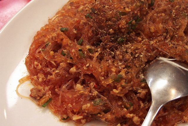 - 春雨、挽肉、葱をショウガと唐辛子などで炒め煮したものです。つるると辛みをまとわせて口にすべり入る春雨と肉の旨みをしっかりとじこめた挽肉のプリプリ感がいいです。料理に文句はありませんが、正直なところご飯にかけて食べたかった一品でした。(笑)客飯の時に是非試してみたいです。(az)