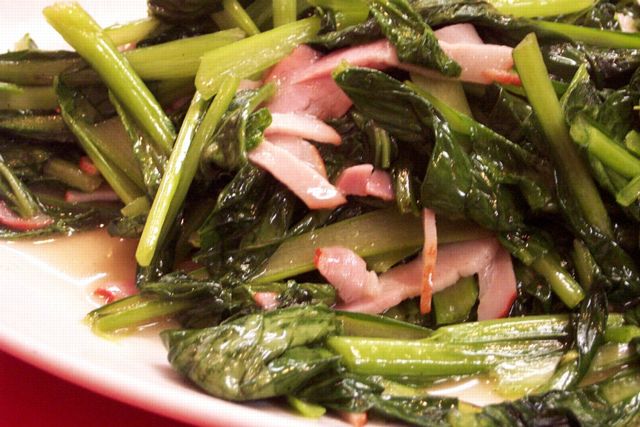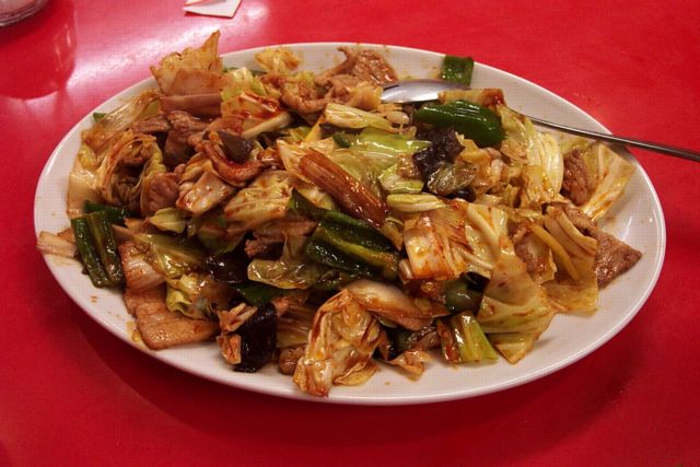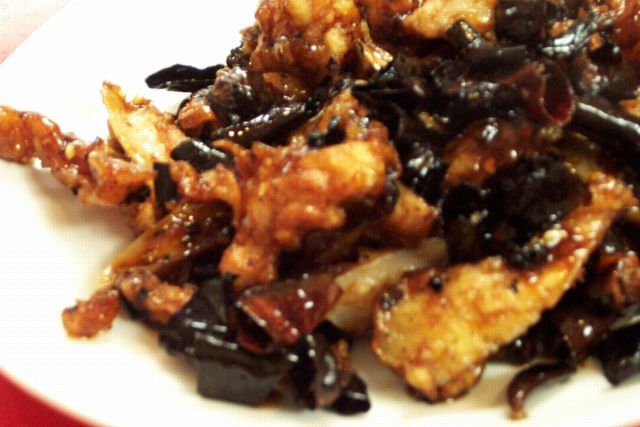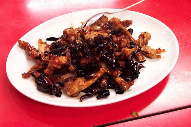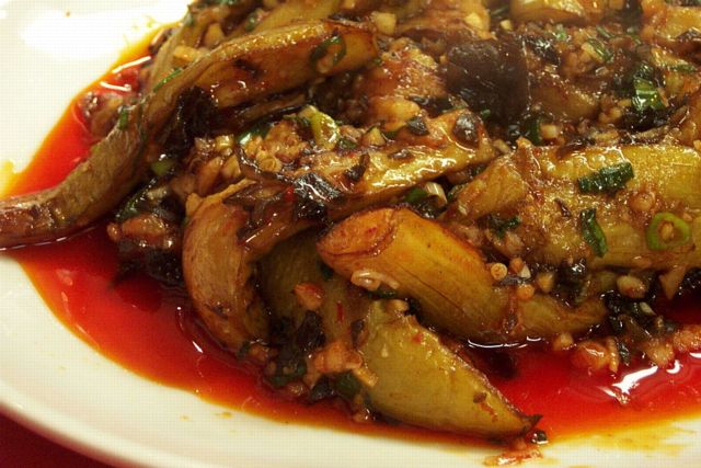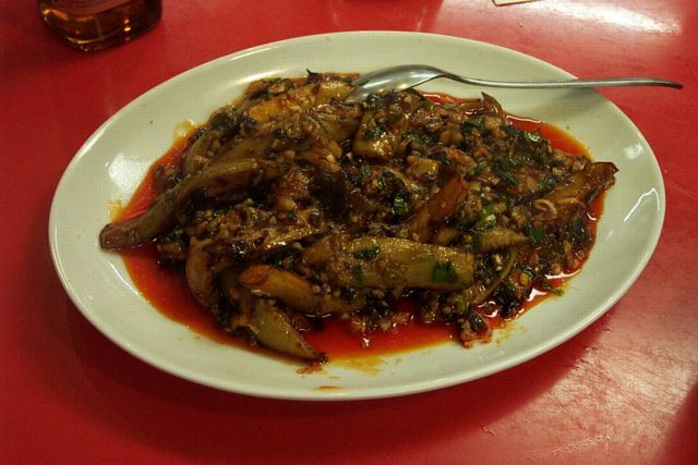 - 今日食べた中で一番好みです。茄子とピーマンと葱をニンニク、ショウガ、甜めん醤とたっぷりの油と絡ませて炒めた甘辛の一品。でもやっぱり白いお米と一緒に食べたい品でした。(az)
