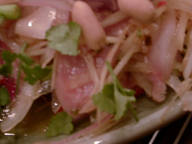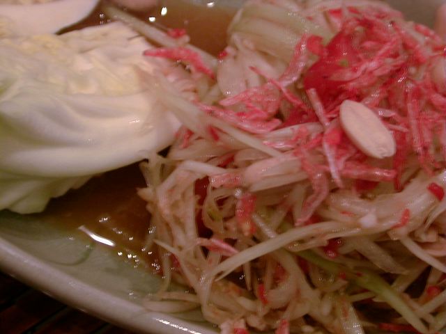 イワシのヤムってのは初めて見たけど、これはおすすめ。イワシは水煮の缶詰めだと思うけど、身がやわらかくて辛めのタレとよくマッチしてます。(め)
